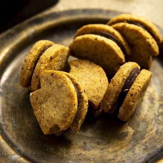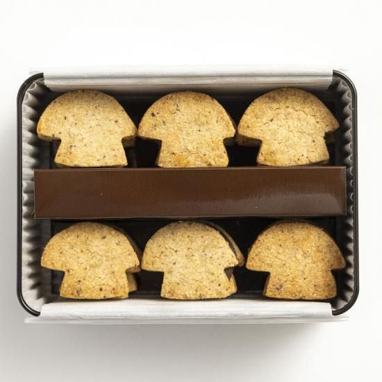 人気のセップ茸の塩サブレでチョコレートをサンドした贅沢なクッキー!そこにカカオニブを加えて風味をプラス。1 枚でも満足度の高いサブレです。